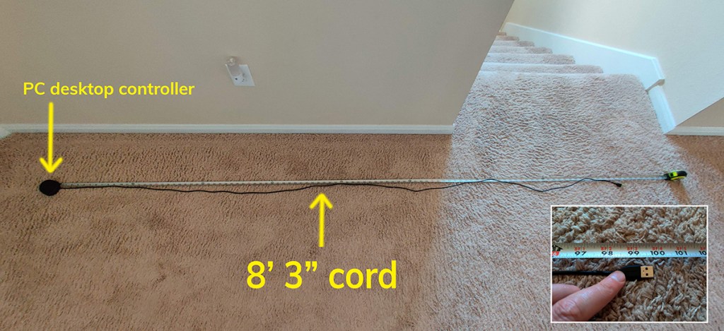 The PC desktop controller comes with a nice, long cord. I measured it at 8-feet 3-inches (99”). The long cord is good for people who have their tower further away from their desk. When coupled with the length of the headset cord (which is 3-feet 9-inches), it offers plenty of total length.